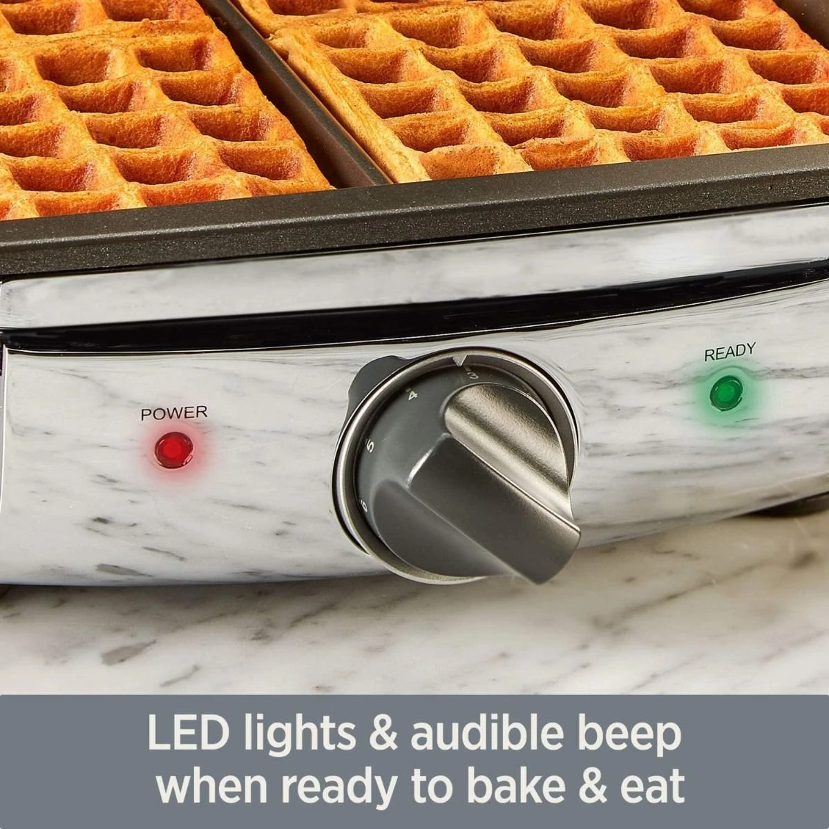 - “Ready” light and LED indicator signals when to pour batter and when the waffle is complete
