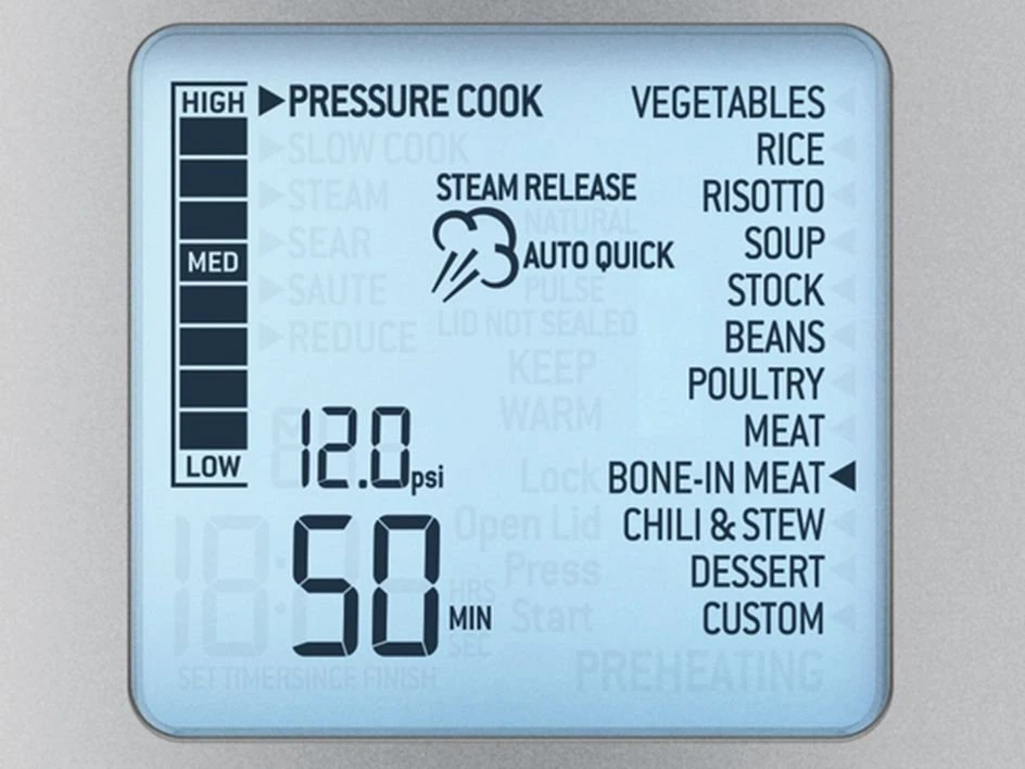- Programmed functions: reduce, sauté, sear, slow cook, pressure cook, pressure steam, keep warm