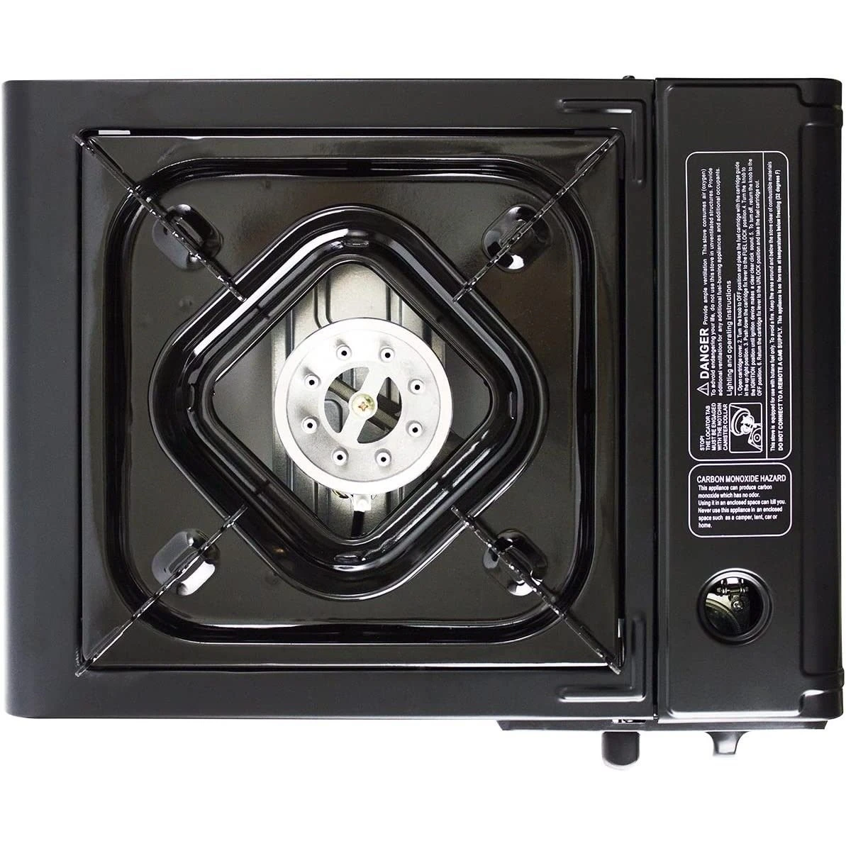 - Aluminum Single Burner Camp Stove with removable enamel-coated Drip Tray