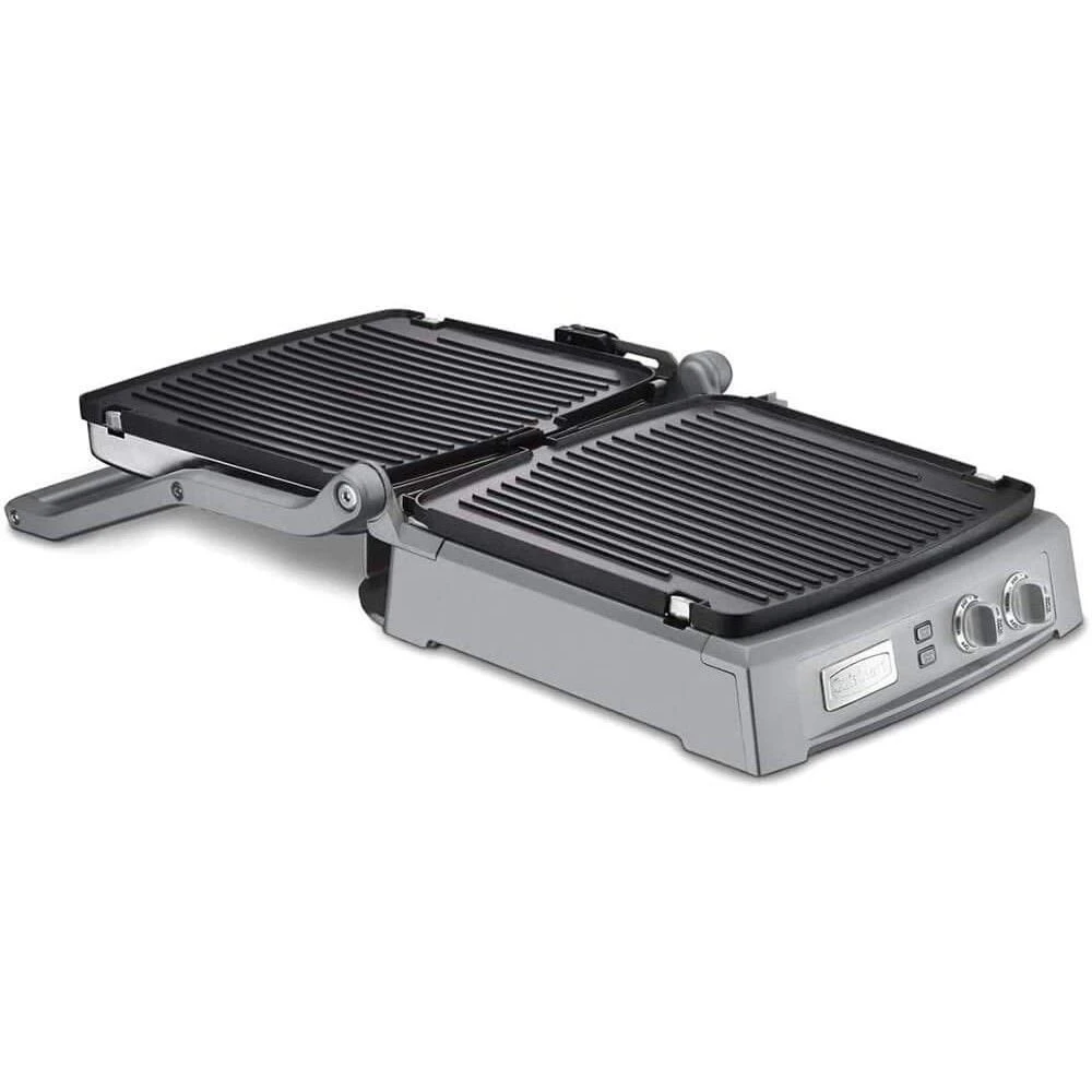 Expand your countertop grilling horizons with six cooking options and 240 square inches of grilling surface on the Cuisinart Griddler Deluxe! Reversible nonstick grill plates can be configured for contact grill, full griddle, full grill, panini press, half grill/griddle, and top melt cooking options. The sear function heats to 500°F for up to two minutes, allowing you to get great grill marks and searing on everything from burgers and steaks to vegetables and sandwiches. Dual-zone temperature controls harness 1800W of cooking power to let you cook foods at different temperatures at the same time. Juices and grease drain away from cooking food and into the integrated rear tray for easy collection. Red and green indicator lights display when the cooking surface is heated and ready for use, while the grill automatically shuts off after two hours as a safety precaution. The brushed stainless steel housing is easy to wipe clean and looks greatIncludes a dishwasher-safe cleaning/scraping tool and recipe/instruction booklet. Put the versatile Cuisinart Griddler Deluxe to work for any meal and enjoy everything from pancakes and sausage, to panini and melts, to burgers and steaks!