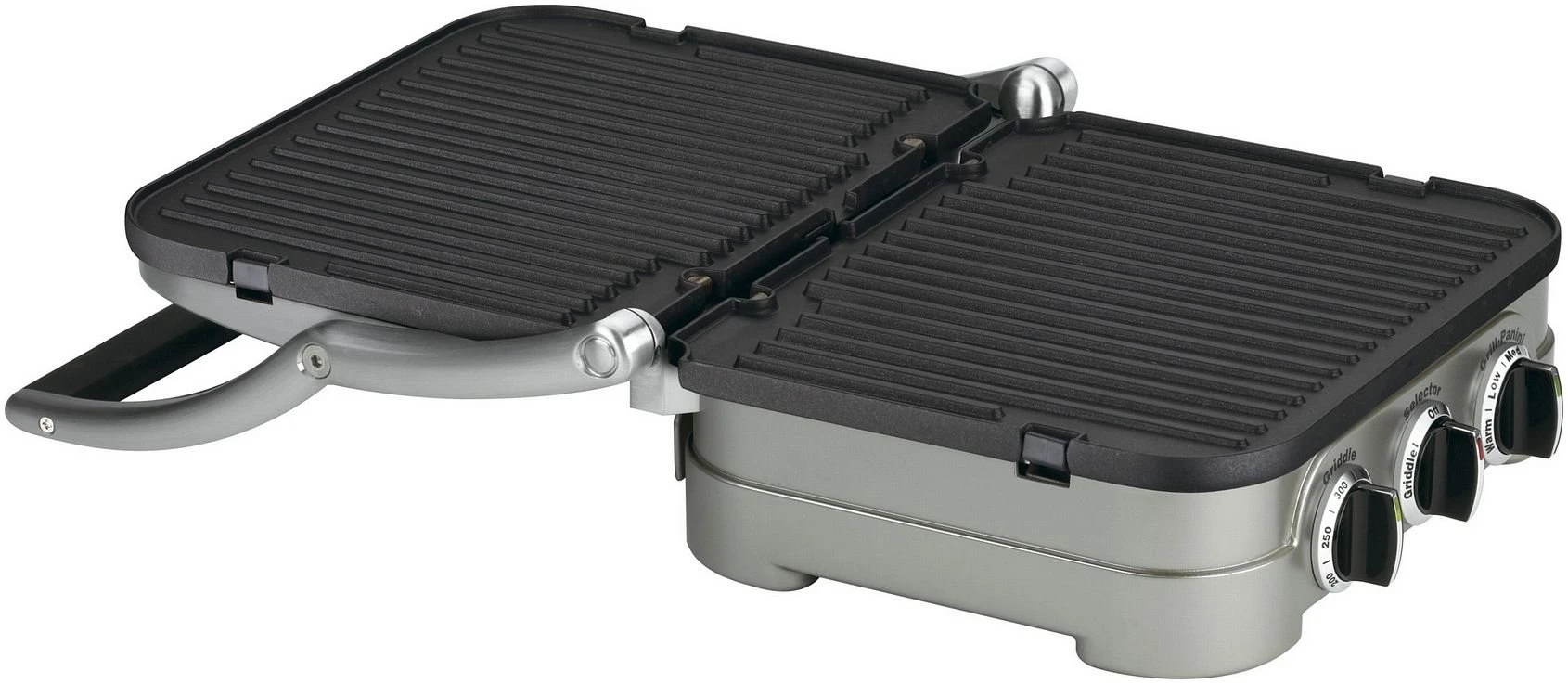 The Stainless Steel Griddler is Cuisinart’s latest addition to the Griddler line. This unit is very versatile being able to switch between grill (panini) plates or flat griddle plates.
