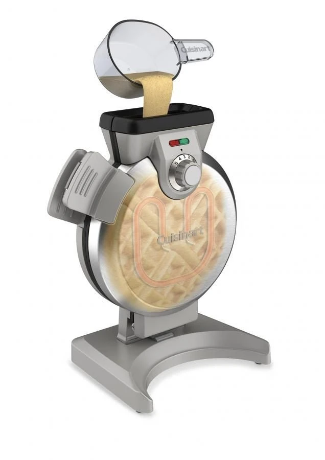 Featuring an easy to fill pour spout, the Cuisinart Vertical Standing Waffle Maker fills from the bottom up, precisely cooking your waffle to a uniform thickness. Included with your Cuisinart Standing Waffle Maker is a measuring scoop that provides the exact amount of batter needed to make your waffles. Messes are avoided by a convenient notch underneath the handle of the measuring cup which easily sits on the edge of your bowl of batter and allows excess to drip back into your bowl away from your countertop! Who knew clean up could be so effortless?