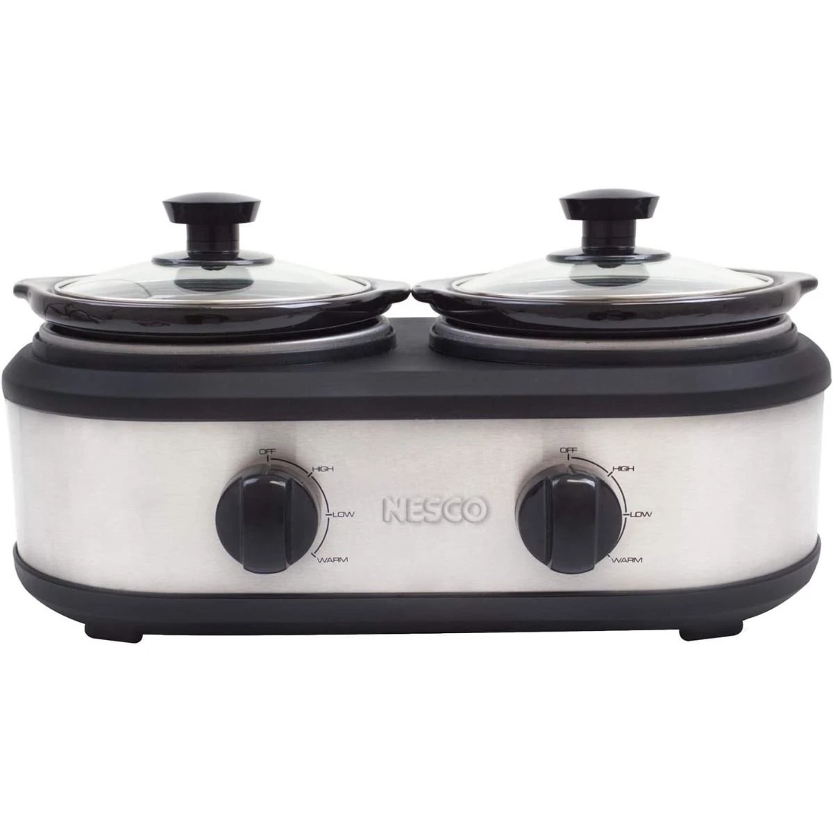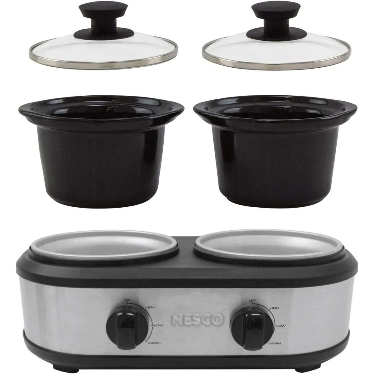 Whether you’re hosting a game night or holiday family gatherings, ensure your snacks & sides stay hot by using the Nesco Dual Serving Slow Cooker! Featuring two 1.25-Quart lidded crocks with dual-controlled heating elements, this slow cooker is perfect for providing appetizers, dips, or soups to guests on any occasion. Each side can be set to High, Low, or Auto (Keep Warm) Cook, allowing dishes to be kept at different temperatures in one compact vessel. The removable crocks & lids are dishwasher safe, allowing for easy clean-up after your events.