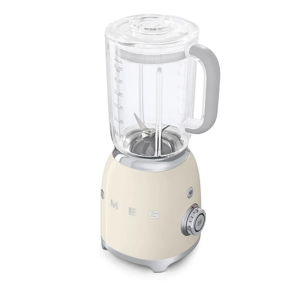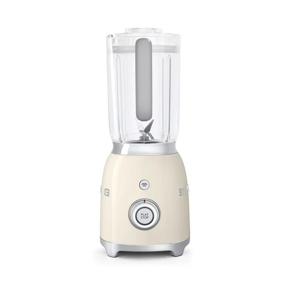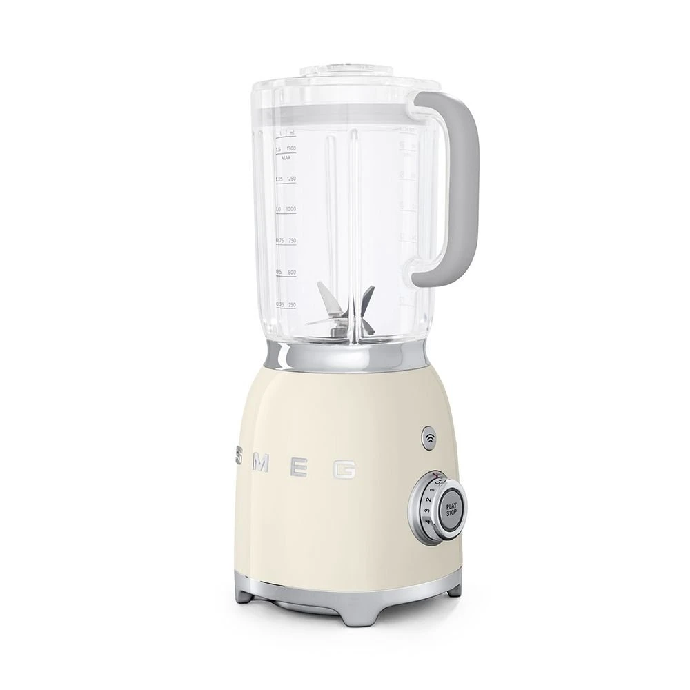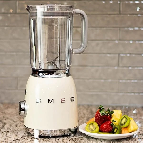 You may be drawn to the SMEG Retro Style Blender Cream for the smooth contours and sleek aesthetic style making it one of the iconic award-winning designs of domestic small appliances worldwide. The 3 preset programs are “Ice Crush” to crush ice cubes, “Smoothie” to produce dense and creamy textures, “Pulse” to increase the speed of the blender to your liking by pressing a button. It operates at 600 watts,120 volts and a frequency of 60 hertz. Removable blades, adjustable to 4 speeds (Max 16,000 rotations per minute), which guarantee the desired degree of mixing. Light, easy to clean jug with dishwasher-safe lid, measuring cup, and anti-splash spout. Another popular feature is the cord wrap on the bottom so that the cord is hidden for storage. This keeps your countertop tidy especially if you have open shelving. Simplicity continues in the one knob operation so there is no clutter of buttons. The anti-slip feet keep it firmly in place as the blender operates with stainless steel dual blades. Be bold!