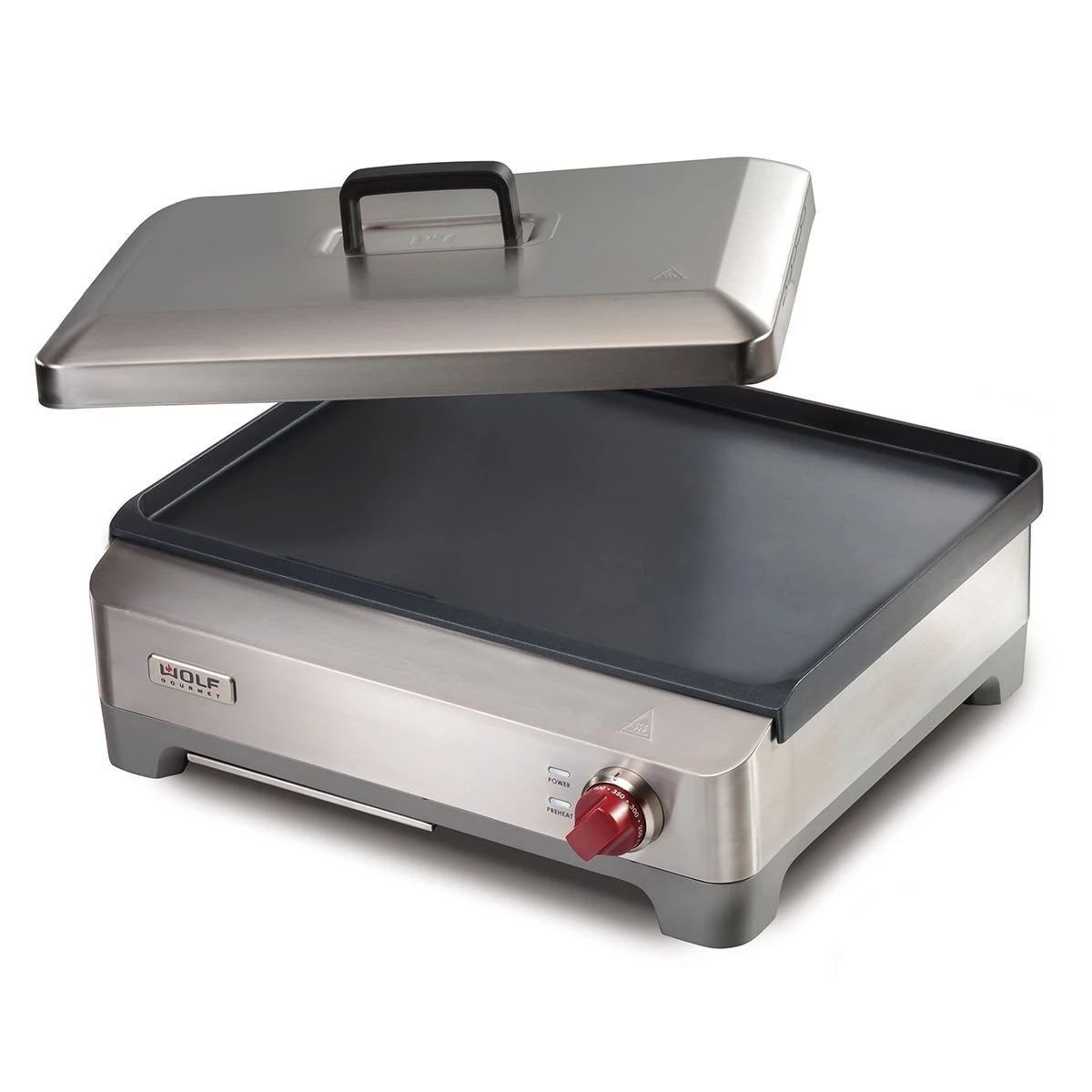 Wolf Gourmet has taken the high-end, high-performance attributes that have made Wolf/Sub-Zero appliances among the most prized in the culinary world, and put them all into a high-quality oven that fits on your countertop. The Wolf Gourmet Precision Griddle with Lid switches between steaming, searing, sauteing, grilling and melting and features a pro-style cooktop made with thick 12″ by 17″ cast aluminum surface similar to a Wolf built-in griddle. The temperature can be set between 150°F to 450°F and includes power and preheat lights to show when the selected temperature has been reached and with the heating element built into the cook surface, this griddle will heat consistent and even. The vented lid allows you to cook anything from lobster to thick cuts of meat and protects the griddle surface when not in use. From london broil and veggies to crab cake appetizers, this innovative, stainless steel countertop griddle takes on whatever cooking duty you have, then cleans up with a quick wipe of its nonstick interior, while the removable crumb/drip tray goes into the dishwasher. Wolf’s commitment to quality and a five-year manufacturer’s warranty mean the Wolf Gourmet Precision Griddle will be creating consistently delicious meals for your family for years to come.